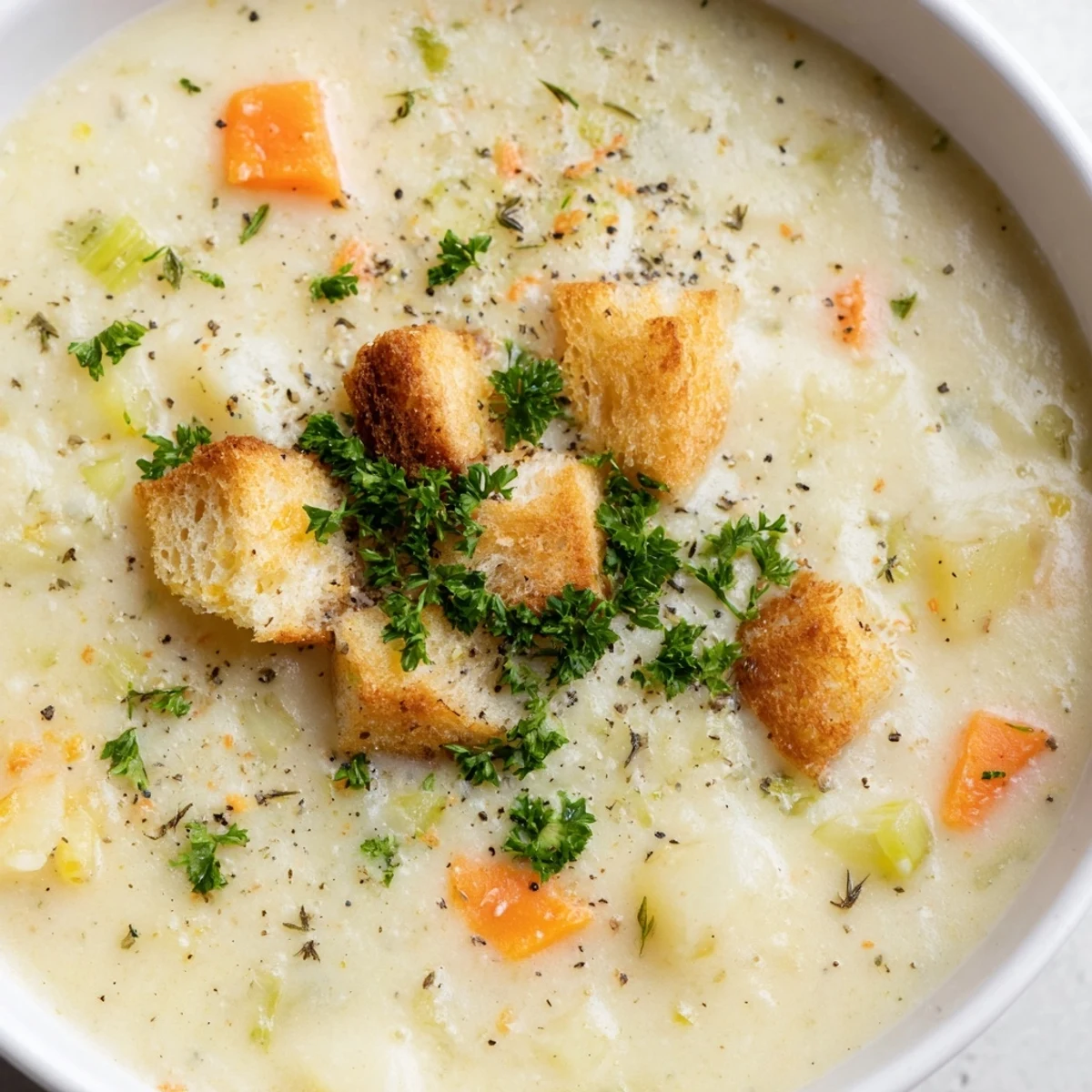 This creamy vegetable soup features a blend of onion, garlic, carrots, celery, and potatoes simmered in vegetable broth. After cooking, the mixture is puréed until smooth and enriched with whole milk and heavy cream for a velvety texture. Seasoned with thyme, salt, and pepper, it’s garnished with fresh parsley and croutons to enhance flavor and texture. This easy-to-make, warming soup is great for cozy evenings and pairs well with crusty bread.