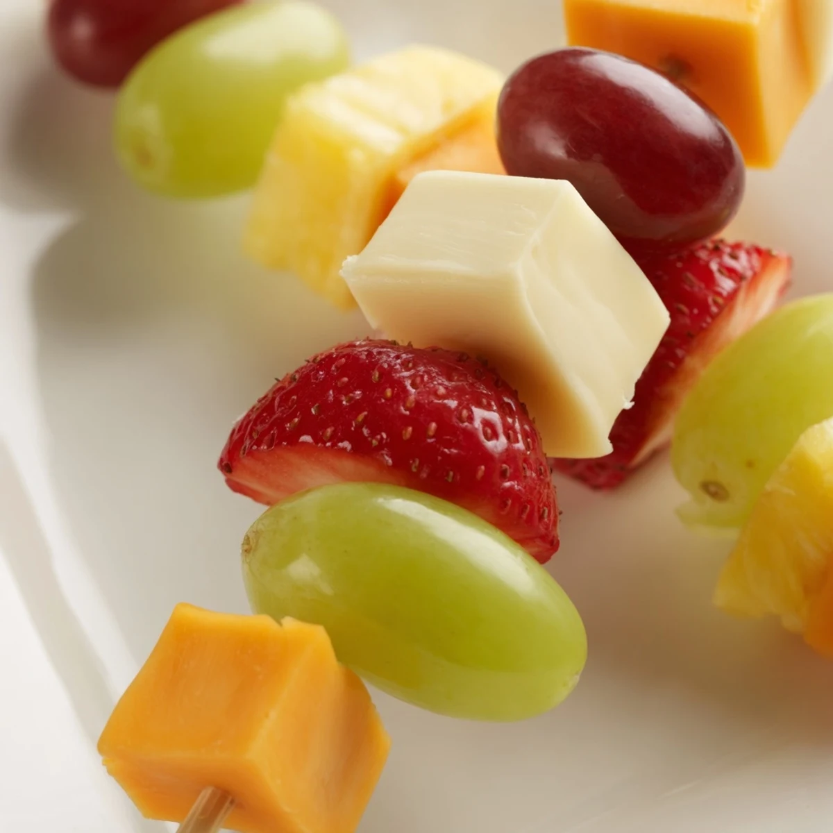 - Alternate fruits and cheese, pushing them gently together without crushing the delicate berries. Create a rhythm—grape, cheese, strawberry, cheese, pineapple, cheese—and repeat until each skewer is full.