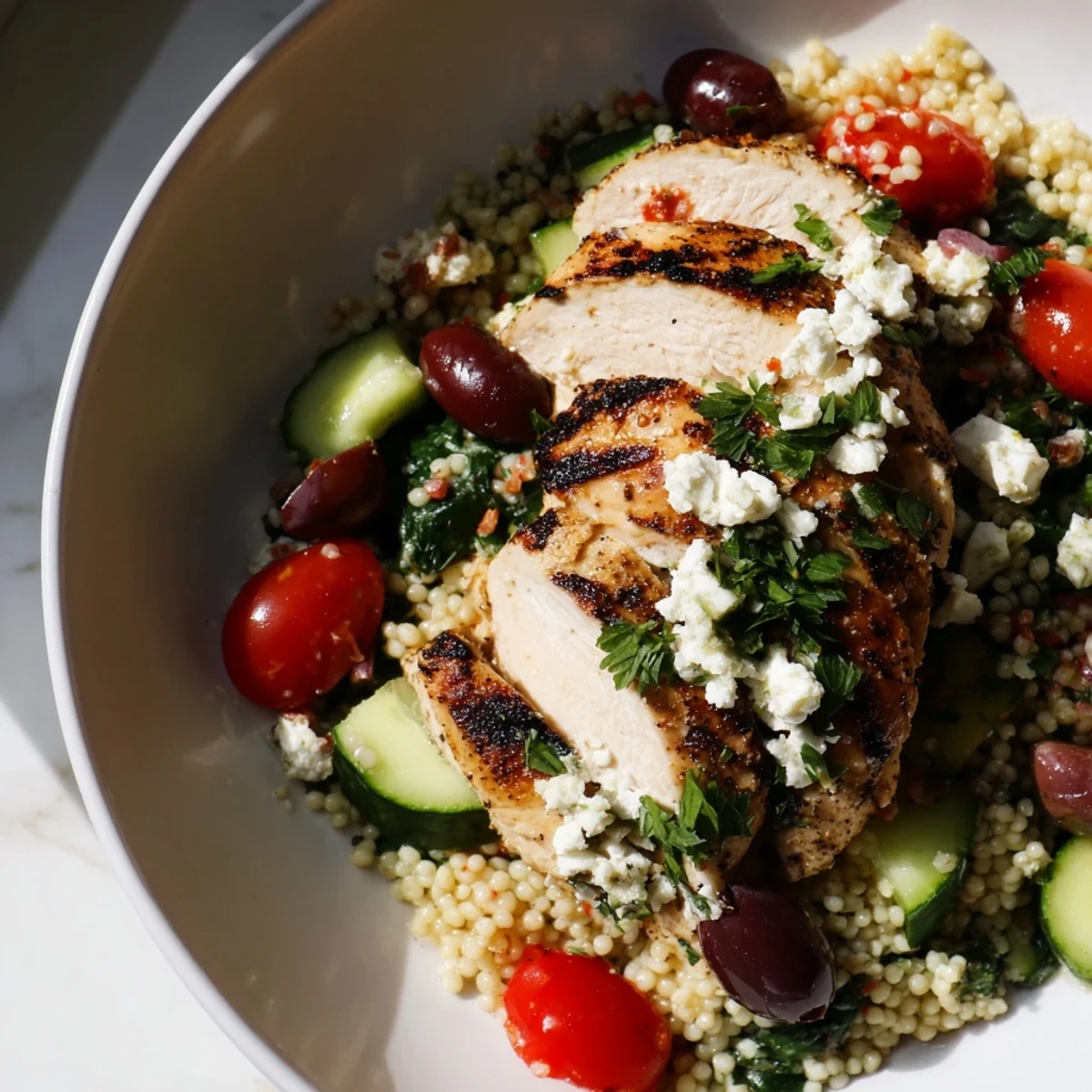This Mediterranean-inspired bowl brings together perfectly seasoned grilled chicken, light and fluffy couscous, and an array of fresh vegetables including cherry tomatoes, crisp cucumber, red onion, and briny Kalamata olives. The star of the dish is the creamy lemon-tahini sauce that ties everything together with its bright, tangy flavor. Ready in just 45 minutes, this wholesome bowl is perfect for weeknight dinners and meal prep alike, offering a balanced combination of lean protein, wholesome grains, and vibrant produce.