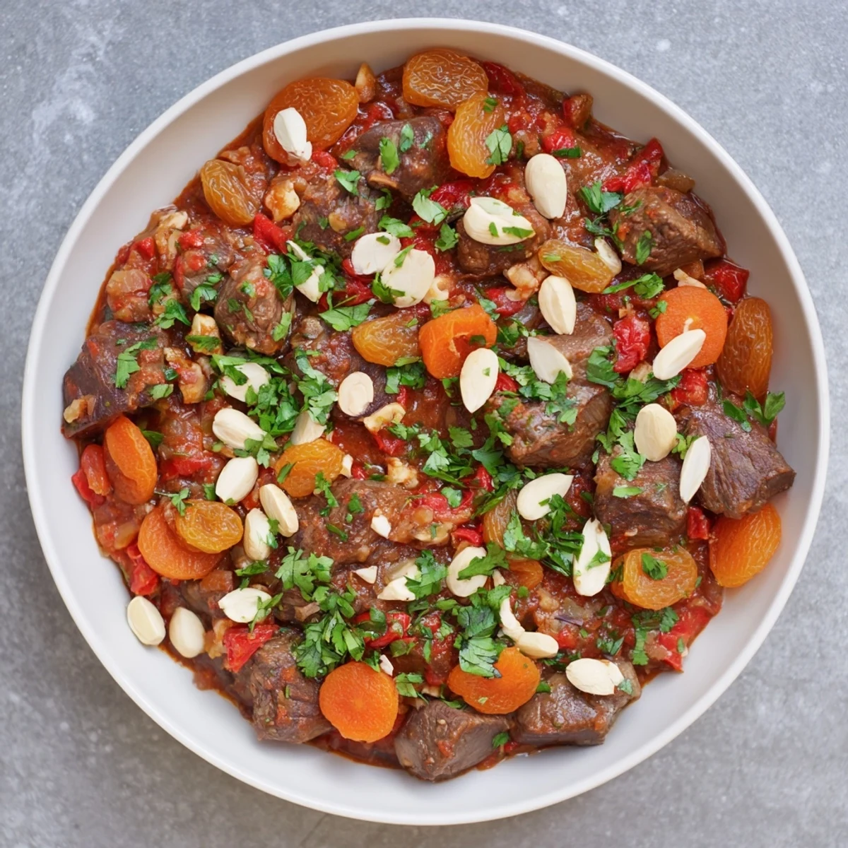 This aromatic Moroccan-inspired tagine transforms lamb shoulder into meltingly tender meat through slow cooking. The dish features warm spices like cumin, coriander, and cinnamon, complemented by the natural sweetness of dried apricots and golden raisins. After 6-8 hours, the lamb becomes fork-tender, and the sauce thickens into a rich, fragrant gravy. Toasted almonds add crunch, while fresh herbs brighten the finished dish.