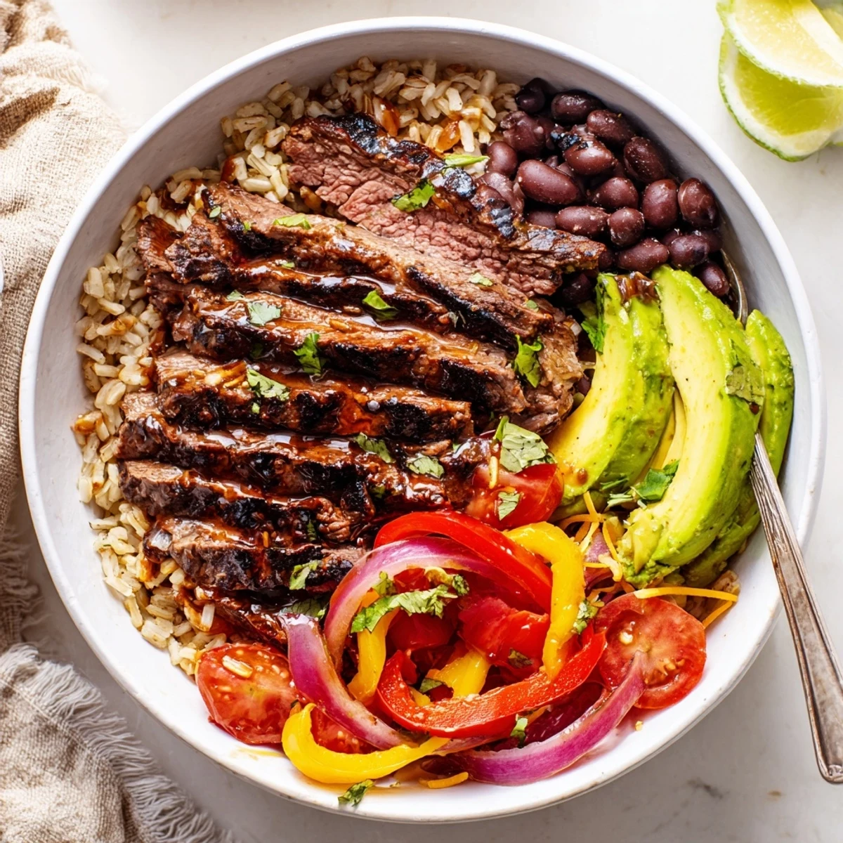 This bowl layers marinated flank steak with quickly sautéed red, yellow and green peppers and sweet red onion over warm brown rice or quinoa and seasoned black beans. Finish with sliced avocado, halved cherry tomatoes, shredded cheese, chopped cilantro and lime wedges plus a dollop of Greek yogurt. Marinate briefly for bright flavor, sear hot for caramelized edges, and swap cauliflower rice or grill the steak for variation.