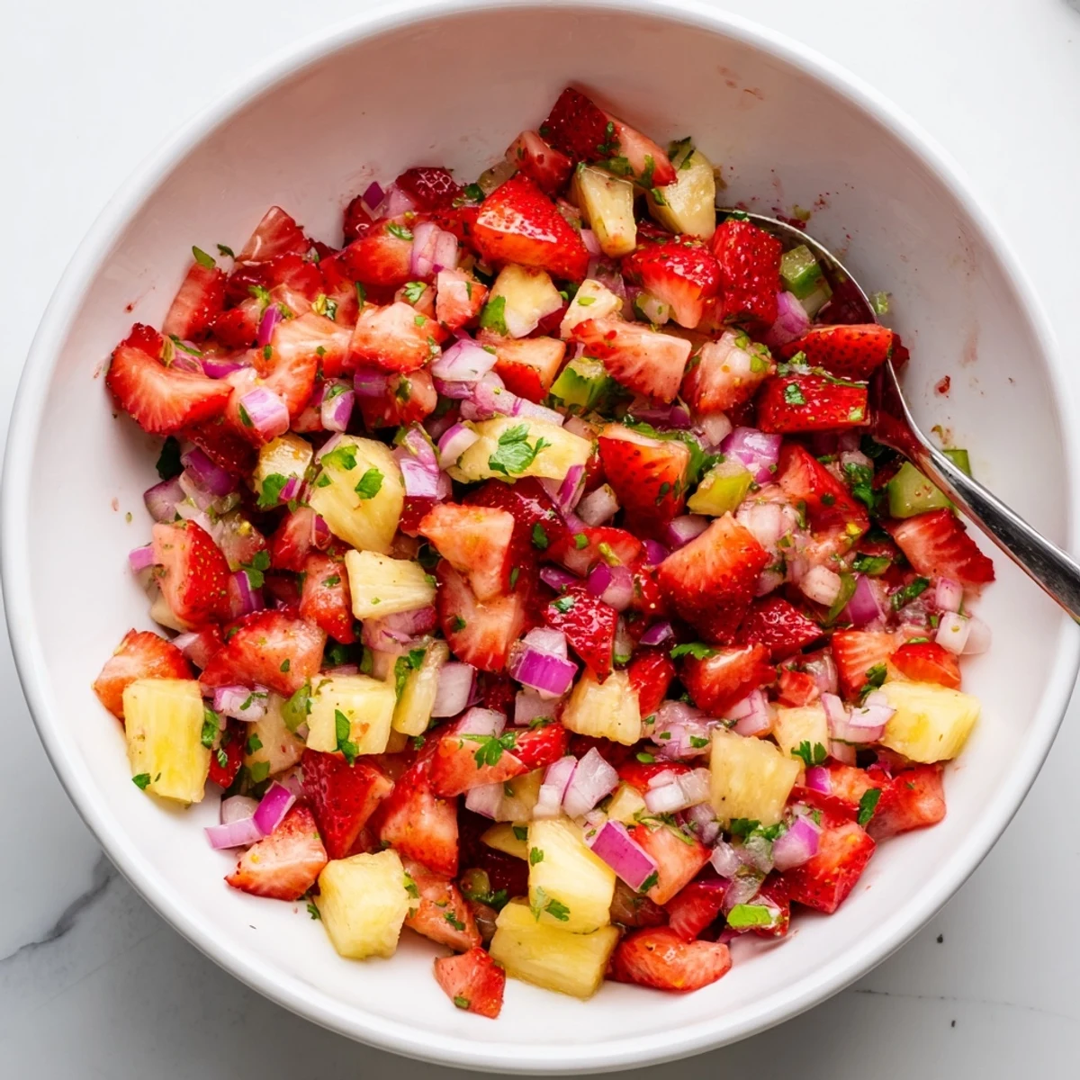 Quick to prepare in about 15 minutes, this bright mix combines diced strawberries and pineapple with finely chopped red onion, seeded jalapeño, and cilantro. Toss with fresh lime juice, salt, and pepper, then taste and adjust. No cooking required; chill up to 2 hours to meld flavors. Serve with chips, grilled chicken, fish tacos, or use as a vibrant salad topper. For milder heat, omit or reduce the jalapeño.
