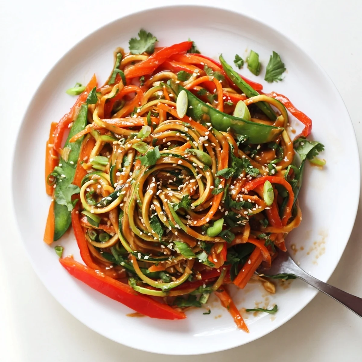 Whip up these flavorful zucchini noodles in under 30 minutes. Spiralized vegetables get coated in a tangy homemade teriyaki sauce that strikes the perfect balance between sweet and savory. The dish comes together quickly: sauté aromatics, stir-fry colorful vegetables until crisp-tender, then add the zucchini noodles and let them absorb the thickening glaze. Each bowl delivers fresh crunch, Asian-inspired flavors, and a satisfying light meal that works for lunch or dinner.