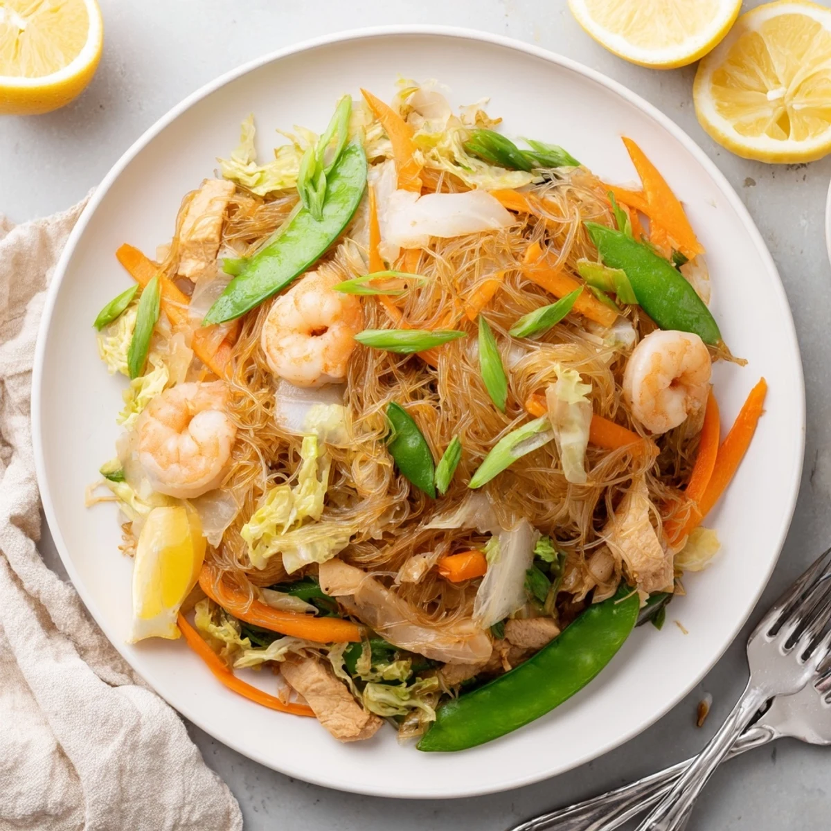 Experience authentic Filipino flavors with this beloved noodle stir-fry featuring thin bihon rice noodles combined with succulent chicken breast and plump shrimp. The dish gets its irresistible taste from a well-balanced sauce of soy, oyster sauce, and fish sauce, while julienned carrots, shredded cabbage, and snow peas add delightful crunch and color.