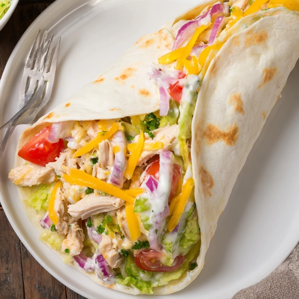 Start by gently sautéing minced garlic in olive oil, then toss in shredded chicken with paprika, salt and pepper until evenly coated and warmed. Stir a quick mayo-yogurt sauce with parsley and lemon. Warm tortillas, layer chicken, cheddar, lettuce, tomato and red onion, drizzle sauce, roll tightly and toast briefly to melt the cheese. Serve warm; add avocado or bacon if desired.